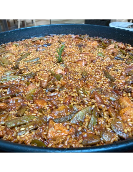 La paella tradicional valenciana con ingredientes naturales de gran calidad y de cultivo propio cocinada con leña de naranjo de manera natural para mantener toda la esencia de los ingredientes.