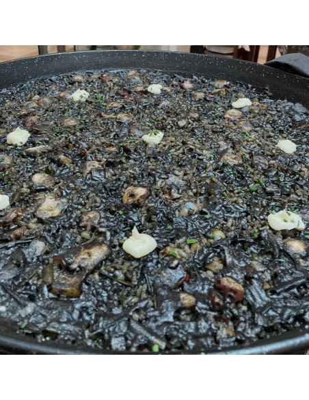 La paella de arroz negro con ingredientes naturales de gran calidad y hecha con leña de naranjo de manera natural para mantener toda la esencia .